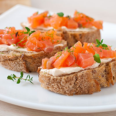 Canapé de salmón y queso fresco, marinera murciana, combinado de croquetas de jamón…